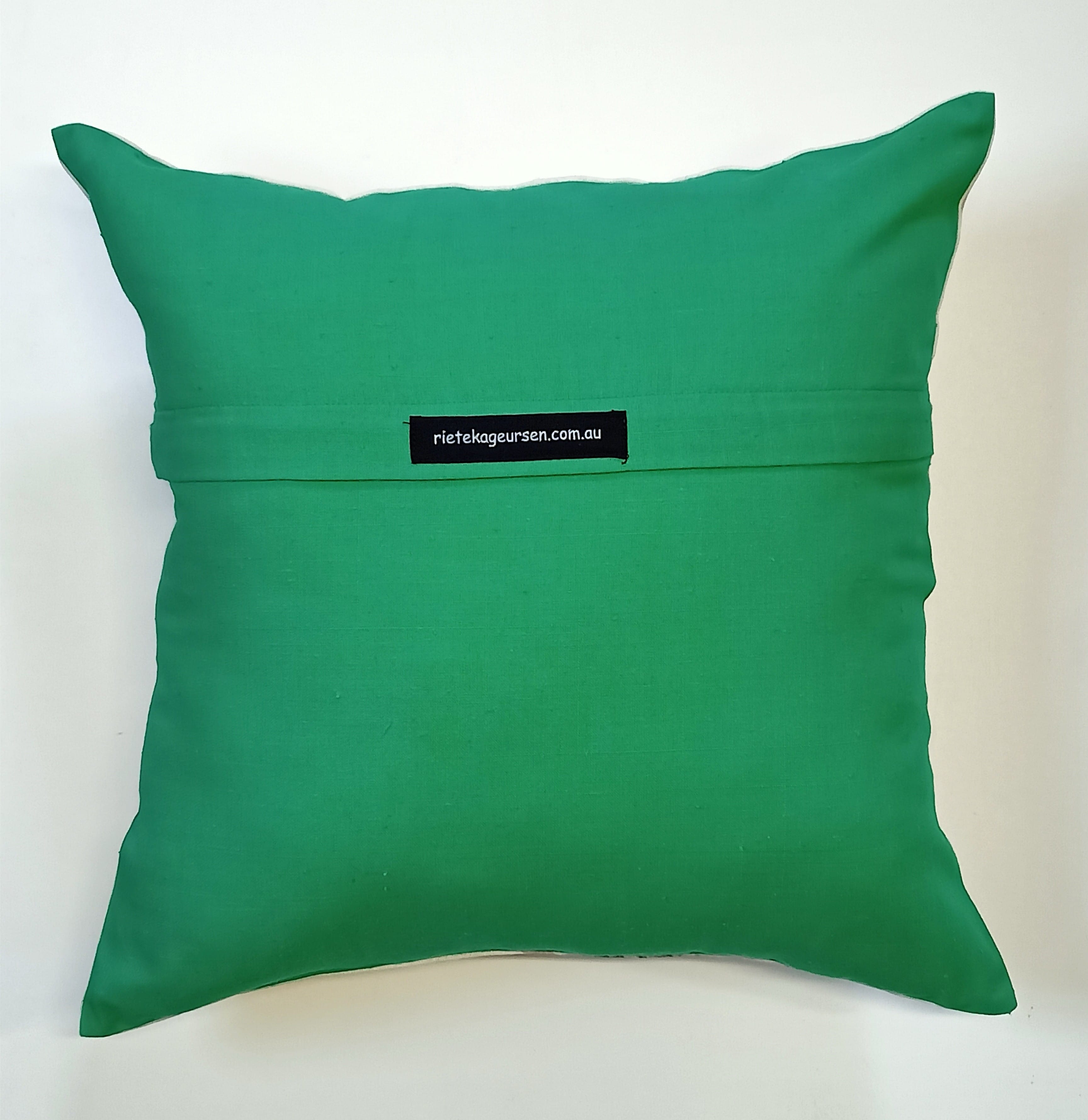 Image on one side only with invisible zip. Available with kelly green backing.