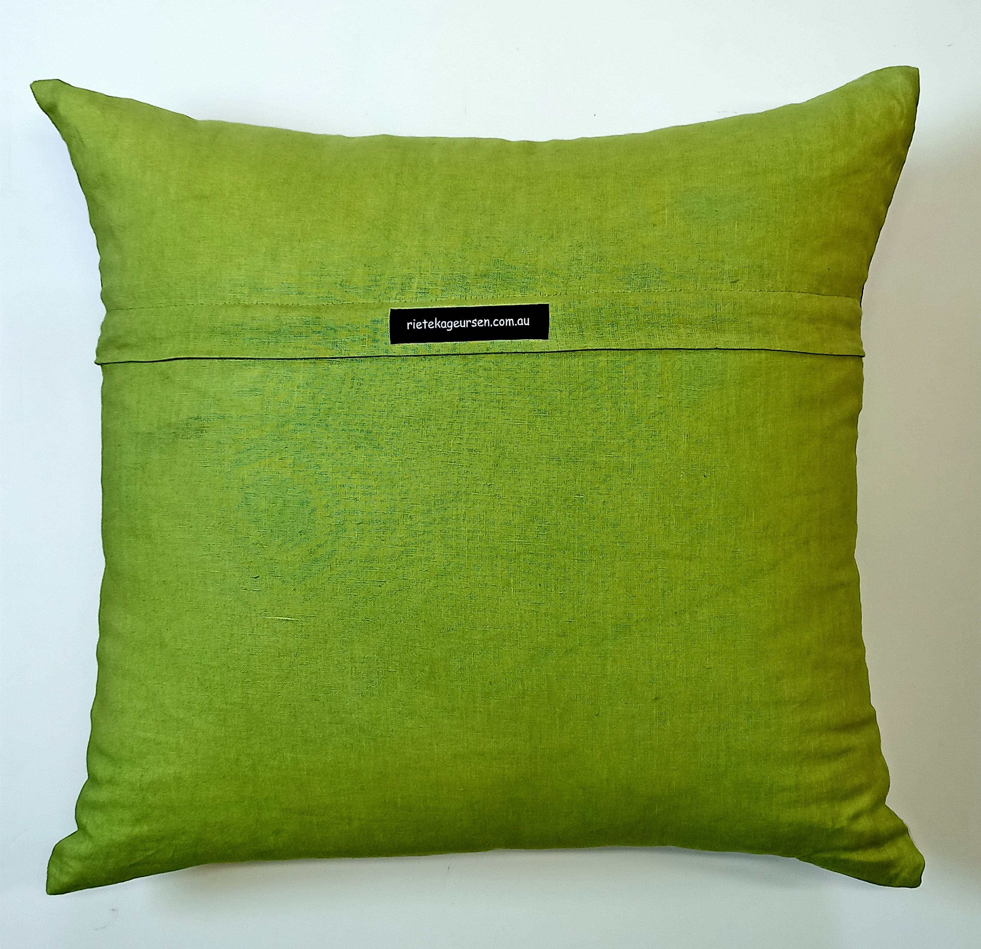 Image on one side only with invisible zip. Available with Apple Green linen backing.